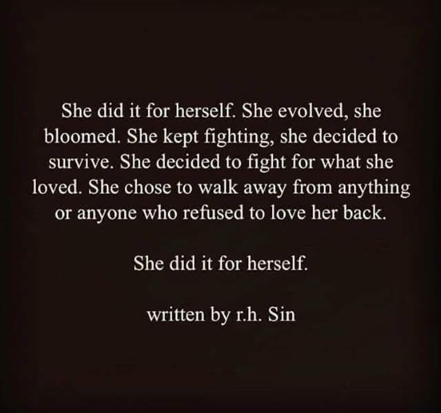 I stopped asking anyone for advice, I threw away my television, I stopped drinking, I stopped medicating myself with pills, I stopped crying the blues to anyone who would listen and faced all my problems by myself and now I wake up everyday and tell myself this is my life and I am the only one who has to live it and the only one who can change it. I turned all my hurt and all my pain and all my suffering into love for myself and I love myself for the first time in my life.