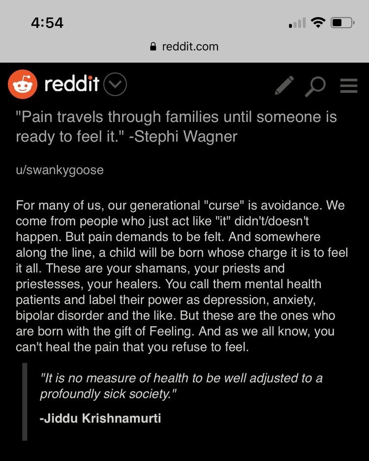 I’ve started to read this book a few times and it was hard to read. It helps make sense of the world today and those steadfast beliefs that we desperately need to change. When I try to read this book I can feel my grandma’s pain and fear, I feel her suffering, I can remember her coldness and how important it was for us to be quiet while visiting. I cry trying to read this book because it gives meaning to my own suffering and why my own mom was unable to love me or my brother. I am also thankful this book was written because it finally helps me understand why I must break free. I need to finish the book now.